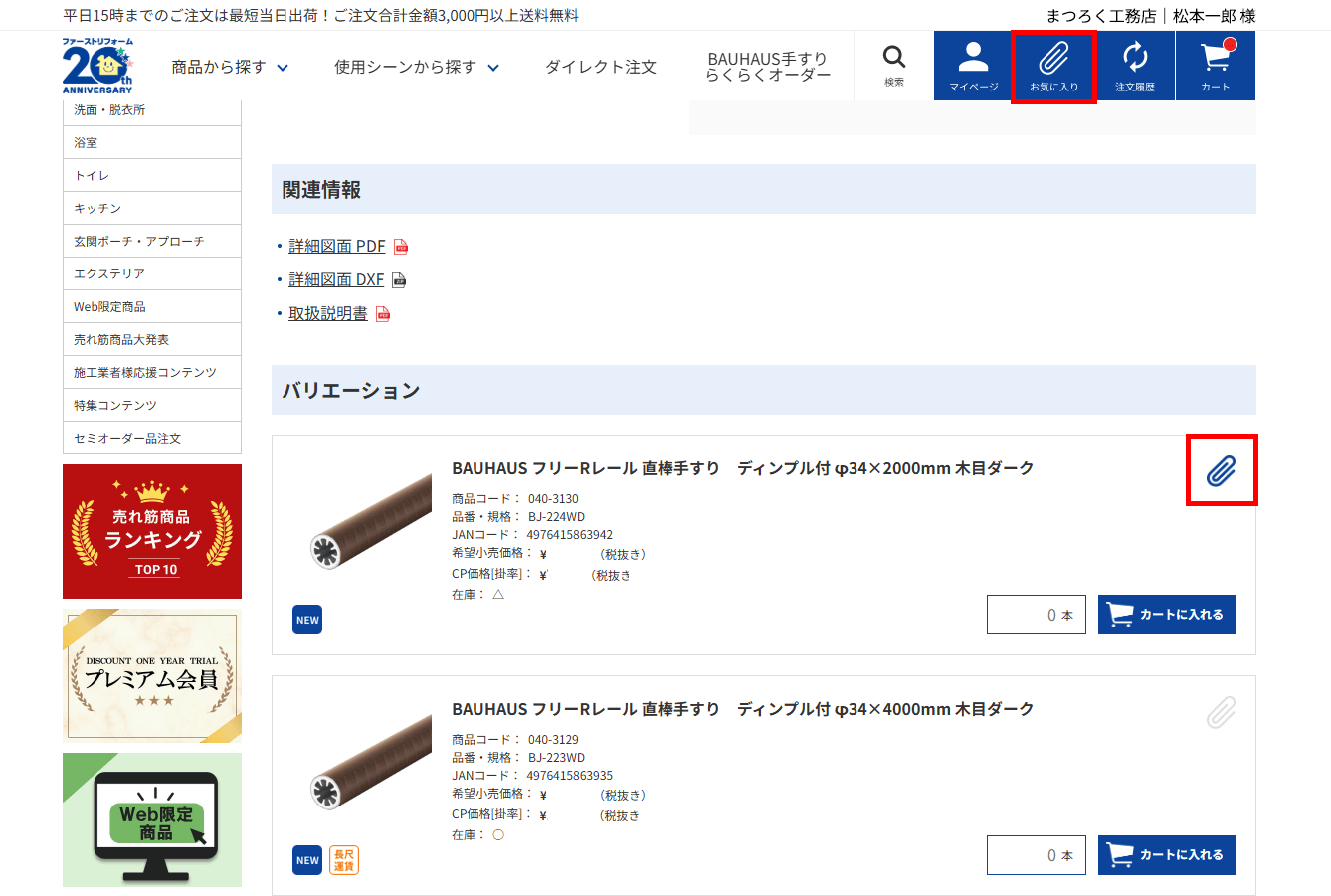 商品の右側に表示されているクリップマークをクリックすると、お気に入り登録できます。