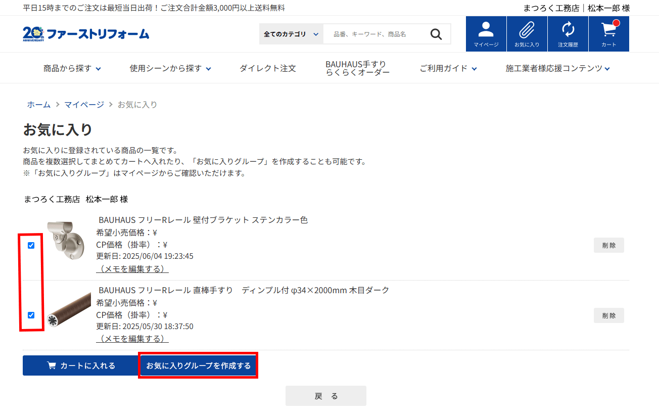 お気に入りした商品でよく使うセットをグループ登録することもできます。