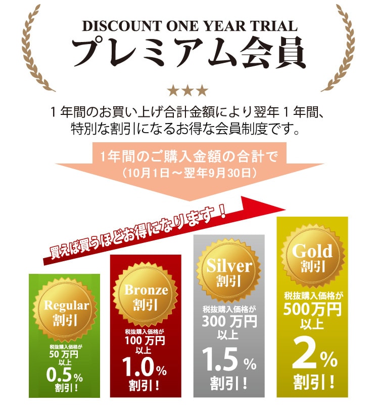 会員ランクには、「ゴールド」「シルバー」「ブロンズ」「レギュラー」があり、1年間のお買い上げ合計に応じて、