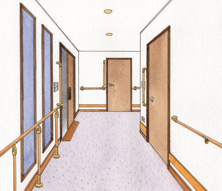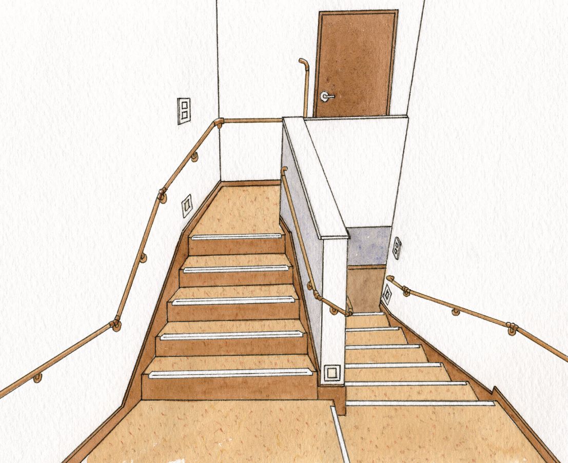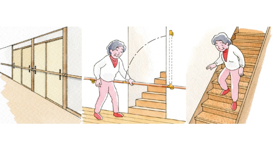 階段・廊下は住宅内の各部屋を利用するための重要な移動スペースです。自立するには、行きたい部屋に不自由なく行けることが大切です。安全に移動するためには、段差の解消、滑り止め、補助手すり等の工夫が必要です。