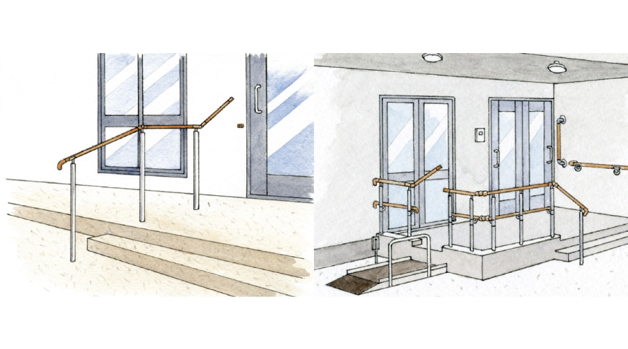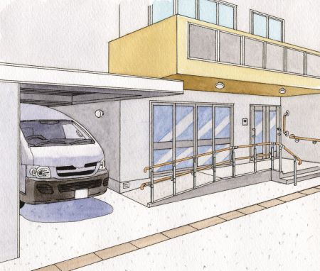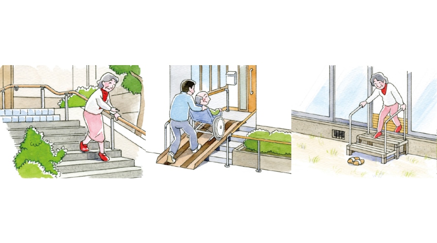 高齢者が社会へ参加するためには、住宅の内部だけでなく、玄関アプローチ等屋外の改造も重要なポイントとなります。自立して安全に外出するには、段差の解消、滑り止め、補助手すり等による工夫が必要です。