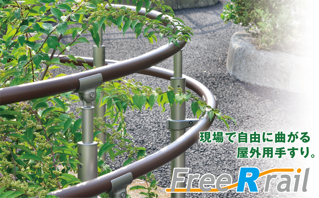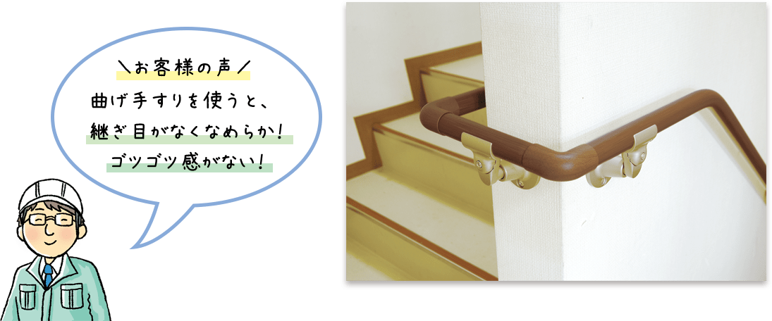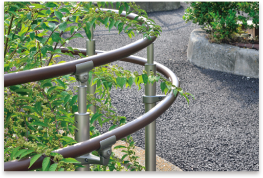 曲がる手すりを使う事で、角度が変わる箇所にも、金具が必要なく、滑らかに。