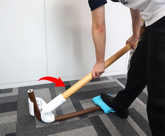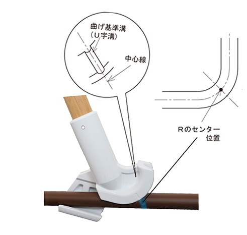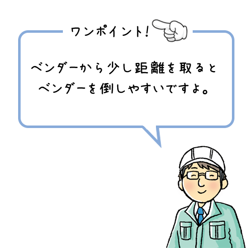 手すり棒をベンダーの開口部にはめ込み、曲げのセンターをベンダーの曲げ基準の中心延長線に合わせます。