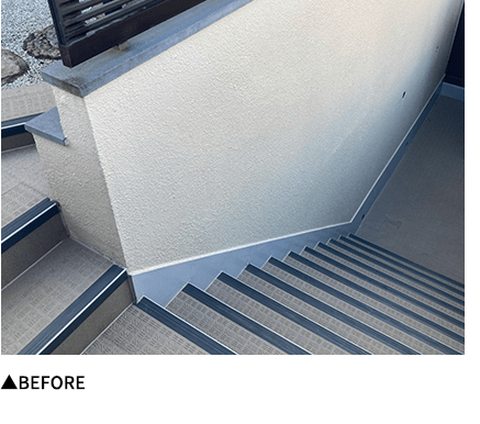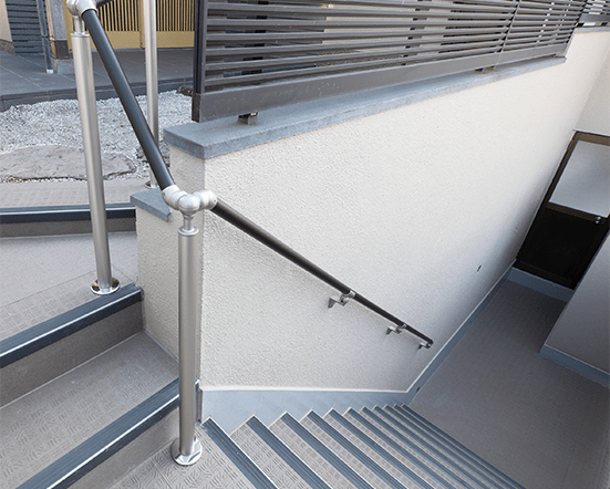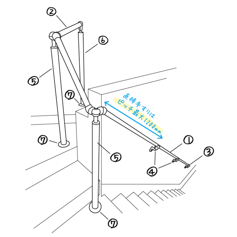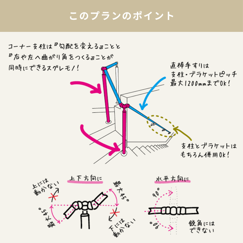 コーナー支柱2本でまわり階段の内側に手すりを連続。