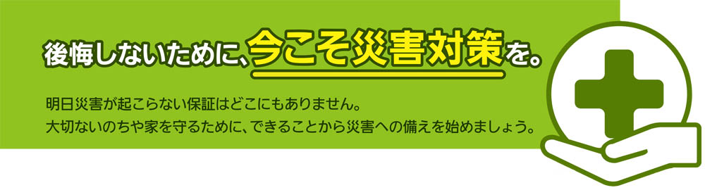 ライフライン、電気やガス、水道が止まる可能性があります。また、危険な場所から避 難した際、そのまま避難生活を送ることも。非常時に生きるための備えが必要です。必要なものがそろっているか、施工業者が一緒にチェック、ご提案しましょう。